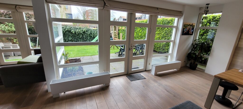 In april 2024 werden de oude Jaga LTV convectoren vervangen door de nieuwe Jaga Hybrids met ventilatoren. Dat duurde ook 1 dag. Omdat deze convectoren stroom nodig hebben werd er in de meterkast een nieuwe groep aangelegd en de kabels lopen door mijn kruipruimte en komen bij de Jaga’s weer boven de vloer. In de poten van de Jagas werden onzichtbaar stopkontakten aangelegd voor de 24V adapters. Ik heb Schimmel Techniek gevraagd de nieuwe Jaga’s niet op de houten vloer maar op het beton te plaatsen dus ze hebben nette gaten in mijn vloer gezaagd.