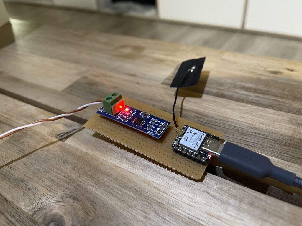 Hier komen we bij de meest ingewikkelde stap van deze handleiding, want hier is enige handigheid met printplaatjes en solderen van belang. We hebben een gaatjesbord waar we de ESP32 chip en UART to RS485 chip op monteren. Vervolgens dienen we deze op elkaar aan te sluiten. En als laatste sluiten we de netvoeding en de twee-aderige kabel op de UART to RS485 chip aan.