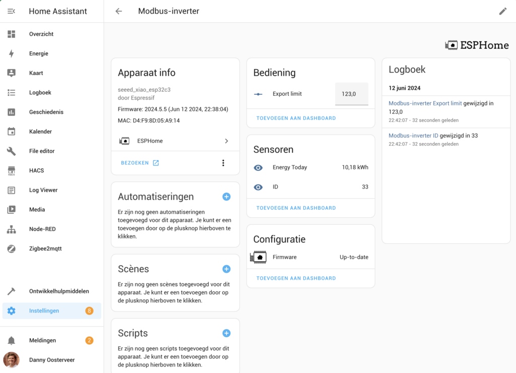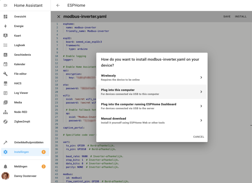 We gaan, voor nu, je slimme kastje eerst met de USB-C kabel op je laptop of pc aansluiten. We gaan dan naar Instellingen -> Addons, open ESPHome en klik op ‘Open WebUI’. In de ESPHome interface klik je vervolgens op + New device, en geef je je device een naam. Ik kies voor Modbus-inverter.