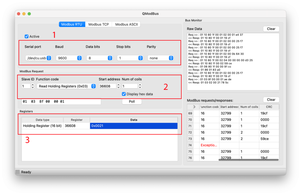 Om met de communicatie met de omvormer te testen, kun je het programma QModbus gebruiken. Dit is een programma dat het mogelijk maakt Modbus-commando’s te versturen, en te kijken wat de responses zijn.