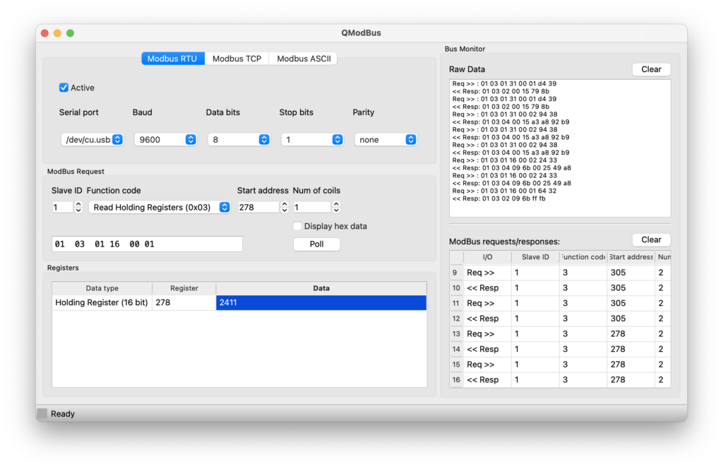 De converter vertelt ons dat dit adres 278 is. Als we met QModbus het adres 278 aanroepen, dan krijgen we de waarde 2411 terug.