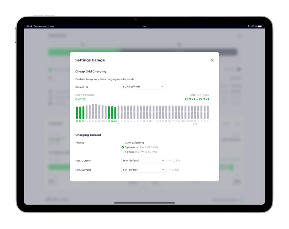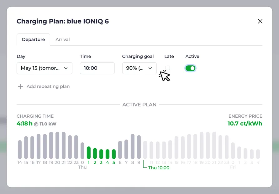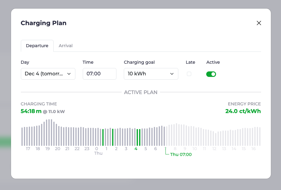 - Vraaggestuurd: Je geeft aan hoe laat je auto op het gewenste laadniveau moet zijn, bijvoorbeeld morgen om 07.00. EVCC kiest automatisch de meest goedkope uren uit om te laden.