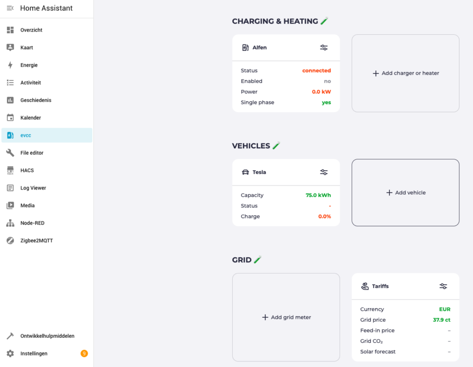 Ik heb daarna ook mijn Tesla, Renault Zoe en dynamische energietarieven toegevoegd via hun Home Assistant entiteiten: