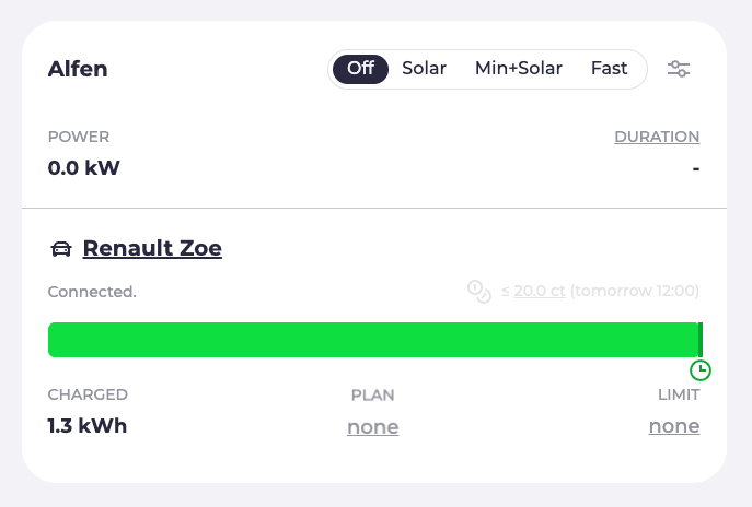 Deze zonnemodus werkt in de basis aanbodgestuurd. Ik kan dus prima de Renault Zoe slim laden, zonder dat ik het batterijniveau van de auto hoef te weten.