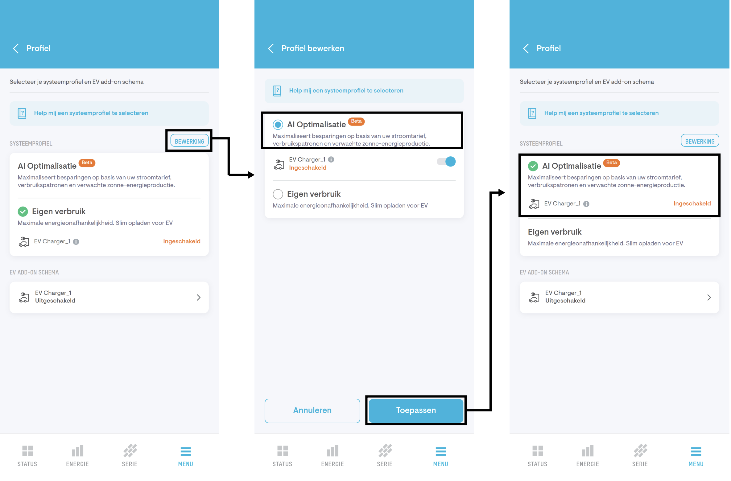 Je systeem weet nu dat je dynamische energietarieven hebt. Nu moet je nog instellen dat de teruglevering automatisch wordt gestopt bij negatieve dynamische energieprijzen. Dat gebeurt met de functie ‘AI Optimalisatie’. Je stelt deze als volgt in: