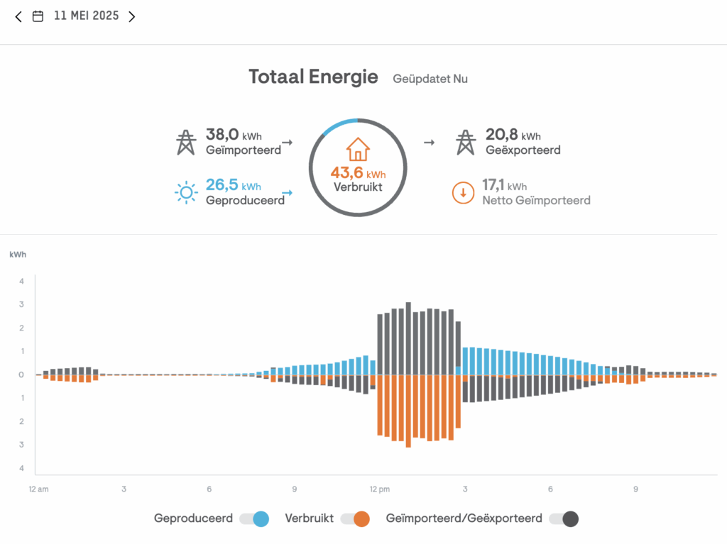 In de app zijn deze genormaliseerde prijzen zichtbaar. Kijken we bijvoorbeeld naar zondag 8 juni 2025, dan zagen we tussen 15:00 en 16:00 een EPEX prijs (kale energieprijs) van -0.05299 euro. In de Epnhase app zag je op dat moment een prijs van 0.092 euro waarbij er dus 0,145 euro aan overige kosten wordt bijgerekend.