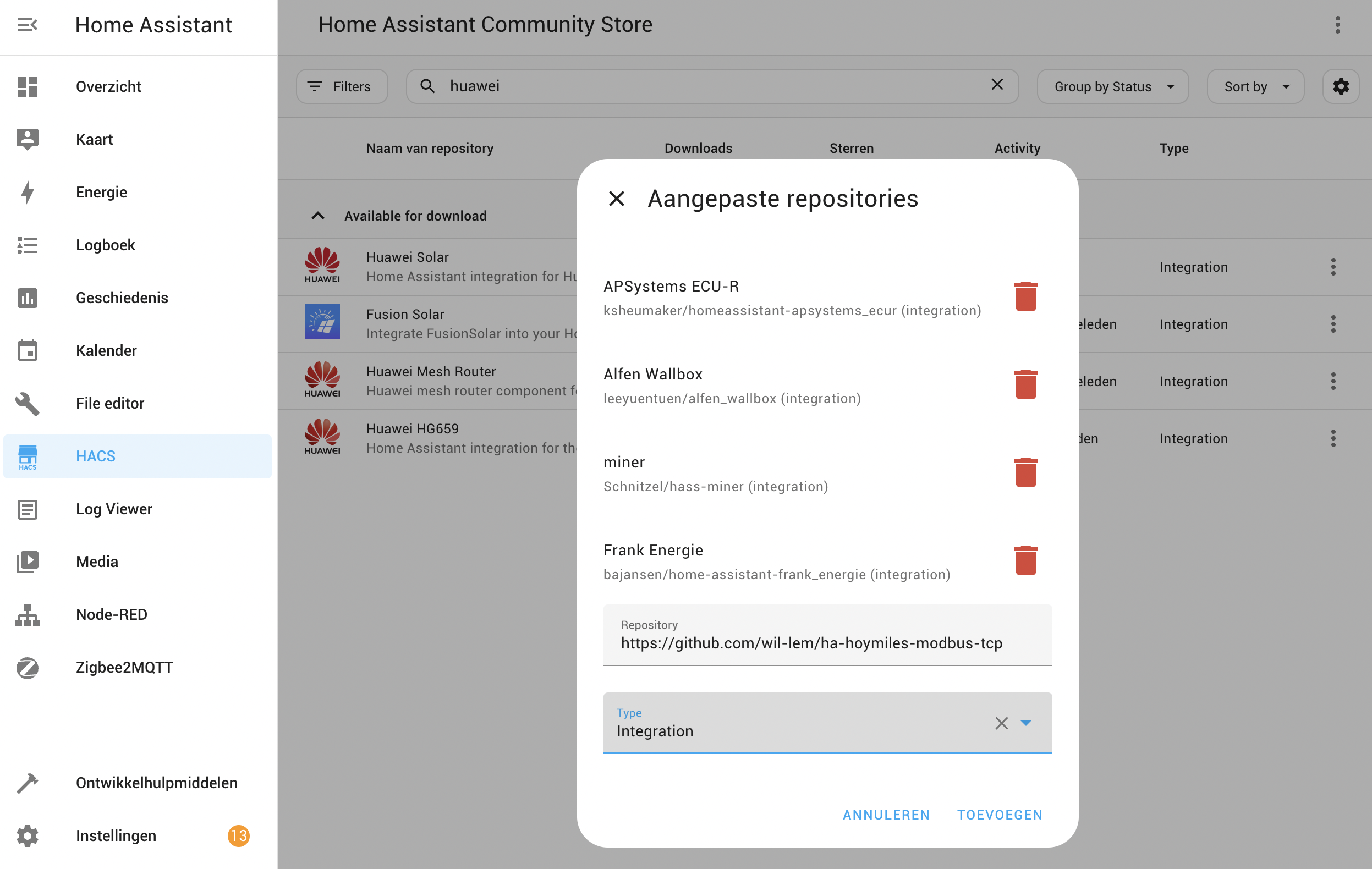 https://github.com/wil-lem/ha-hoymiles-modbus-tcp - Bij “Categorie”, selecteer “Integraties”.