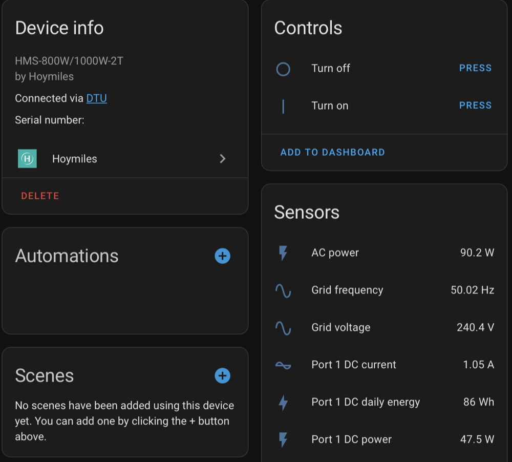 Tenslotte kun je OpenDTU via zijn eigen webinterface configureren, inclusief MQTT settings. Daarmee is de koppeling met HA te maken. De meeste entities zijn auto-discover, ik heb er een aantal handmatig in configuration.yaml (perfectly simple ;)) moeten toevoegen. (Deze heb ik recent omgezet om via MQTT GUI de handmatige items toe te voegen). Dat is allemaal default HA tegenwoordig.