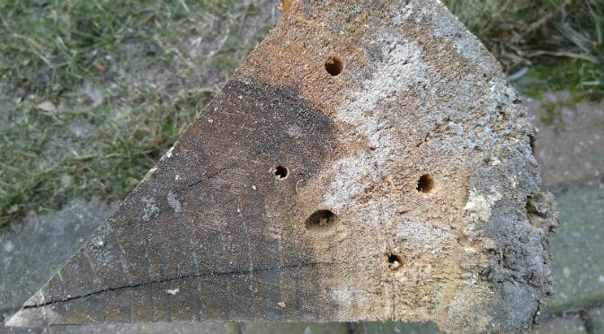 Boor, met de nerf mee, een aantal gaten van verschillende dikte in het hout. Hierdoor kunnen insecten die van gaten houden meteen van je insectenhotel gebruikmaken en hoeven ze niet een paar jaar te wachten tot schimmels, bacteriën of andere insecten gaten hebben gemaakt. Het hout zal ook sneller verteren waardoor er sneller verschillende habitats ontstaan. Je kunt het beste verschillende gaten boren van 2 tot 9 millimeter dik en flink diep. Leg je hout zo neer dat die gaten niet meteen vollopen met regen.