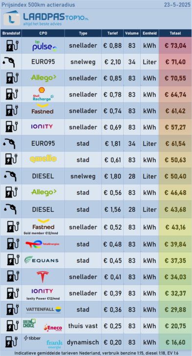 Kijk naar de data van LaadpasTop10. Voor 500 kilometer rijden heb je met een gemiddelde elektrische auto zo’n 83 kWh nodig. Dit zijn de kosten per aanbieder (peildatum mei 2025):