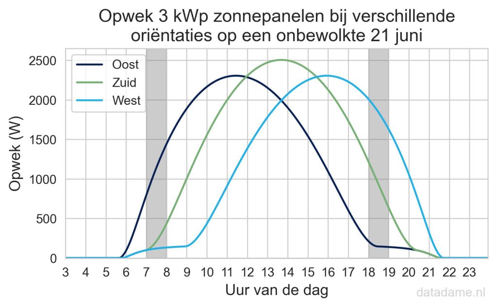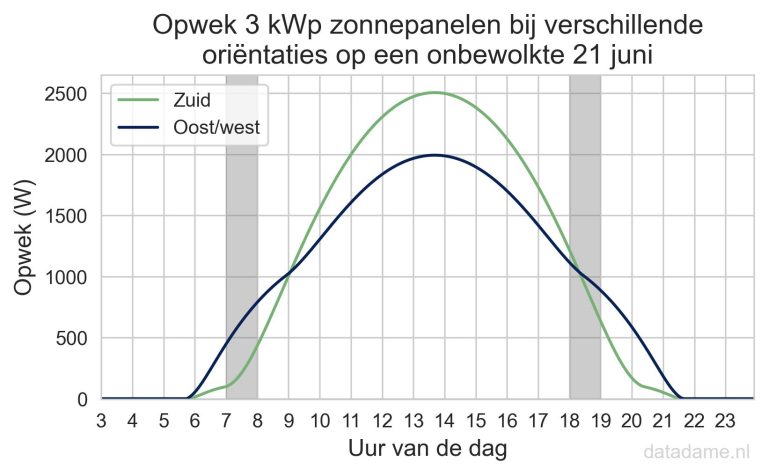Datadame heeft dit met data gestaafd. Op een willekeurige dag, 21 juni, wekken de panelen op het zuiden wekken deze dag het meeste op: 21 kWh tegen 19 kWh voor de panelen op het oosten of westen. Maar de panelen op het oosten wekken tussen 7 en 8 uur ’s ochtends al 800 tot 1500 watt op, waardoor de pot koffie grotendeels van zonnestroom gezet kan worden.