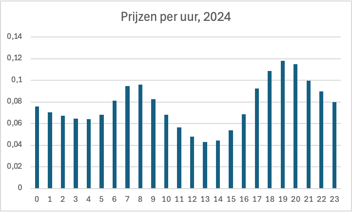 Om dat te staven heb ik de gemiddelde dynamische energieprijs per uur van heel 2024 in een grafiek gezet, met dit als resultaat: